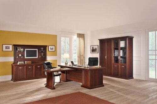 Добротный кабинет Lord изготовлен из плиты ДСП с облицовкой МДФ, качественно имитирующей текстуру натурального дерева. Солидность, престижность обеспечивается темным благородным тоном, рамочными фасадами рабочего стола, греденции, шкафа, фигурными карнизами.
